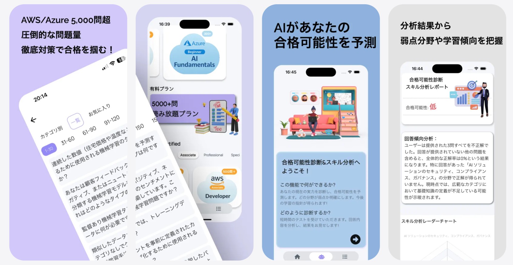 App Storeで公開し、AWS認定試験の受験者から好評を得ています。豊富な問題数と実践的な試験形式により、効率的な学習をサポート。今後の生成AI機能追加により、さらなる学習体験の向上を目指します。
